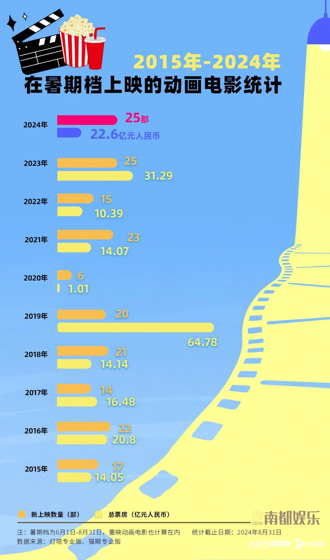 另一方面,南都记者梳理了过去10年的暑期档动画电影票房,只有4年(2016年、2019年、2023年与2024年)超过20亿元,除了2020年与2022年,其余都在15亿元左右。从2015年到2024年,暑期档动画电影一共贡献了超209亿元票房,最多为2019年的64.78亿元。去年共有25部动画电影在暑期档上映,共收获了超31亿元票房,约占档期总票房16%。