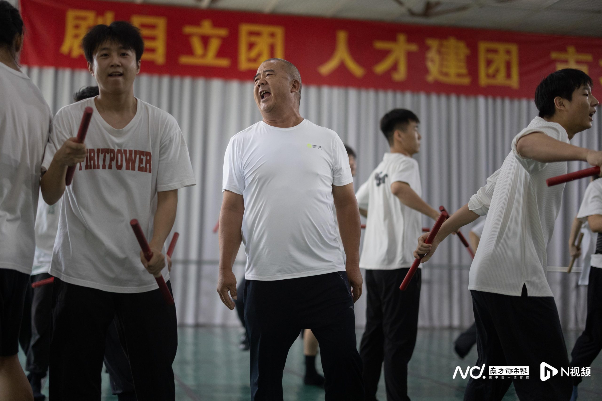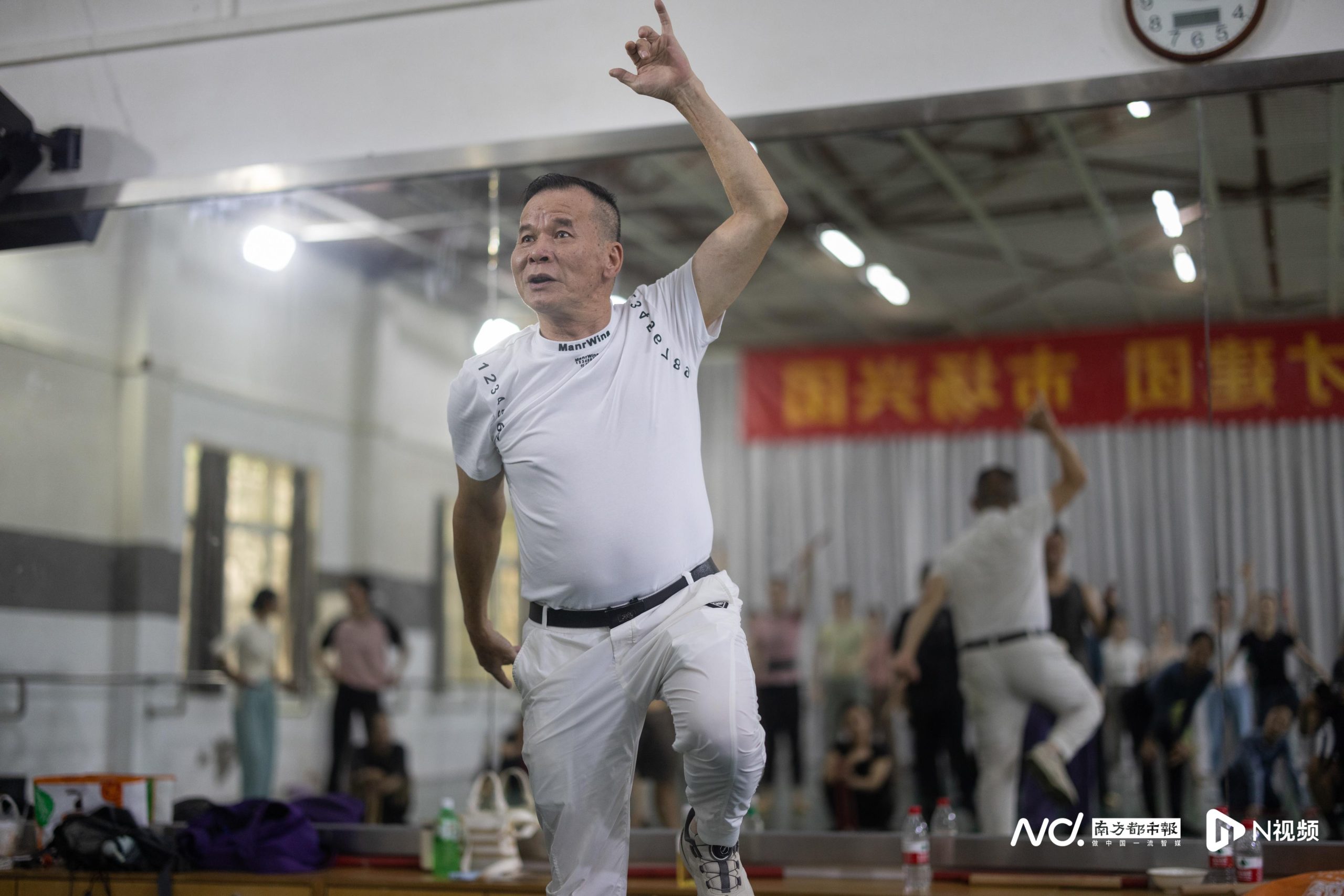 老师傅们亲自上阵。训练场室内几台空调全开,一套动作反复练,没多久大家的衣服还是湿透了。两位非遗传承人的教学方式比较传统,演员们没跳好,师傅急了上脸是常有的事。整个现场非常具有江湖气息:林炳光急起来会在跳舞的演员中间训斥没认真做动作的人,陈来发给南都记者印象最深的是他认真起来目光如炬。