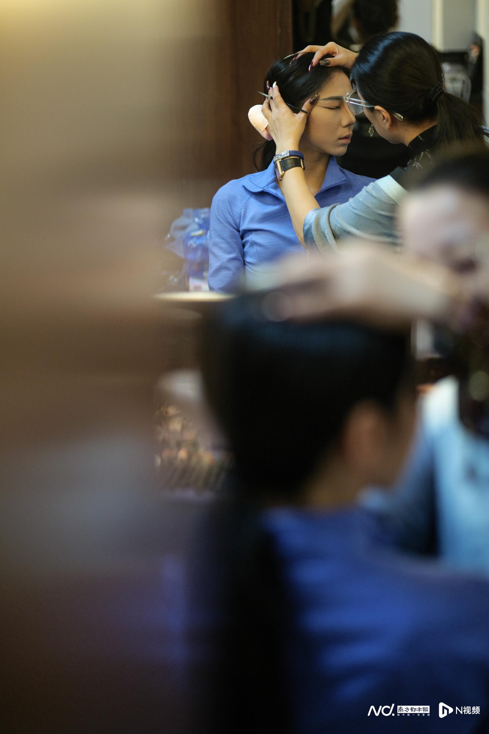 11月9日,首次全妆演出前,王岩在给主演梁琦琦化妆。