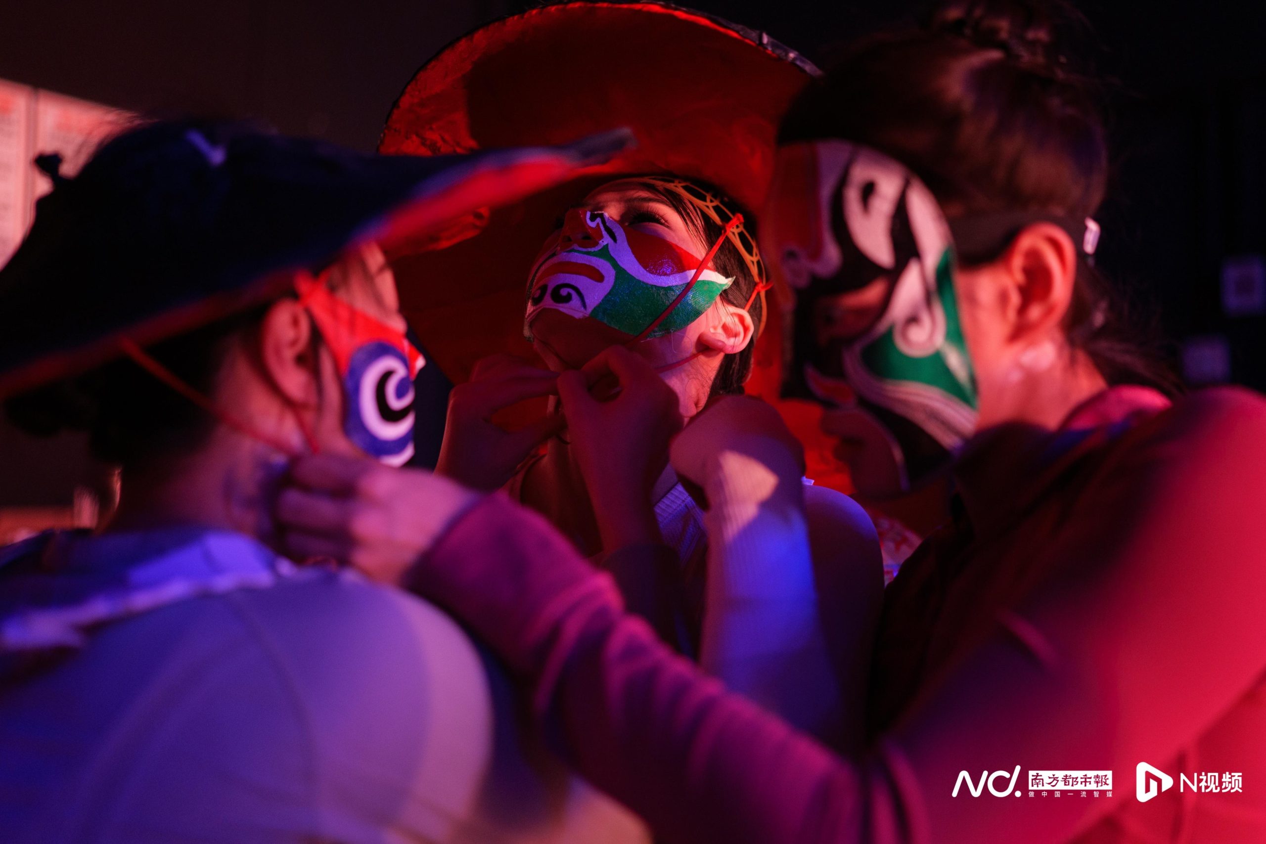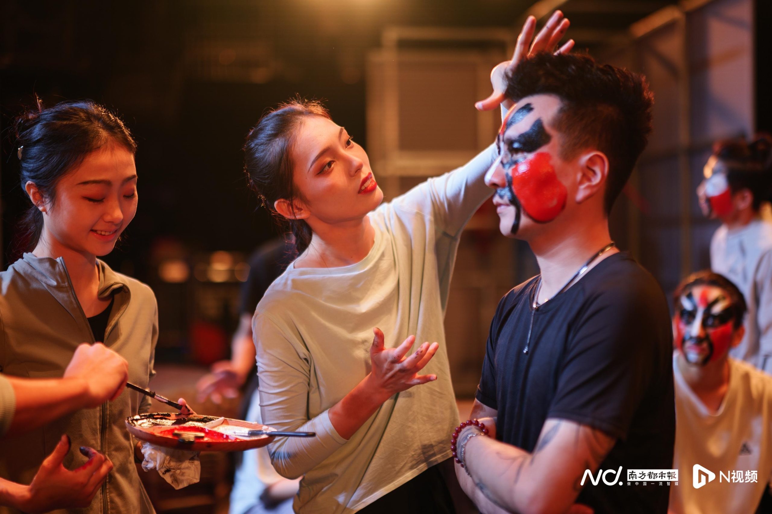 10月12日,胡欣怡和其他演员一起试画男主角最后的脸谱。剧的末尾,男主角的脸谱是由几位演员在表演之中一人一笔画上去的。