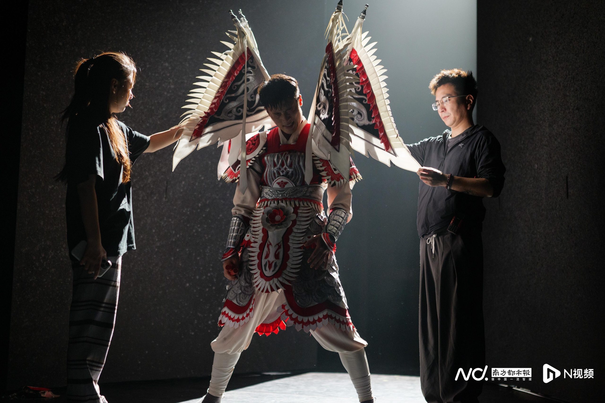 演员袁庆龙负责开场的独舞,他的服装和头饰超过15斤。两位执行编导在帮他调整衣服。