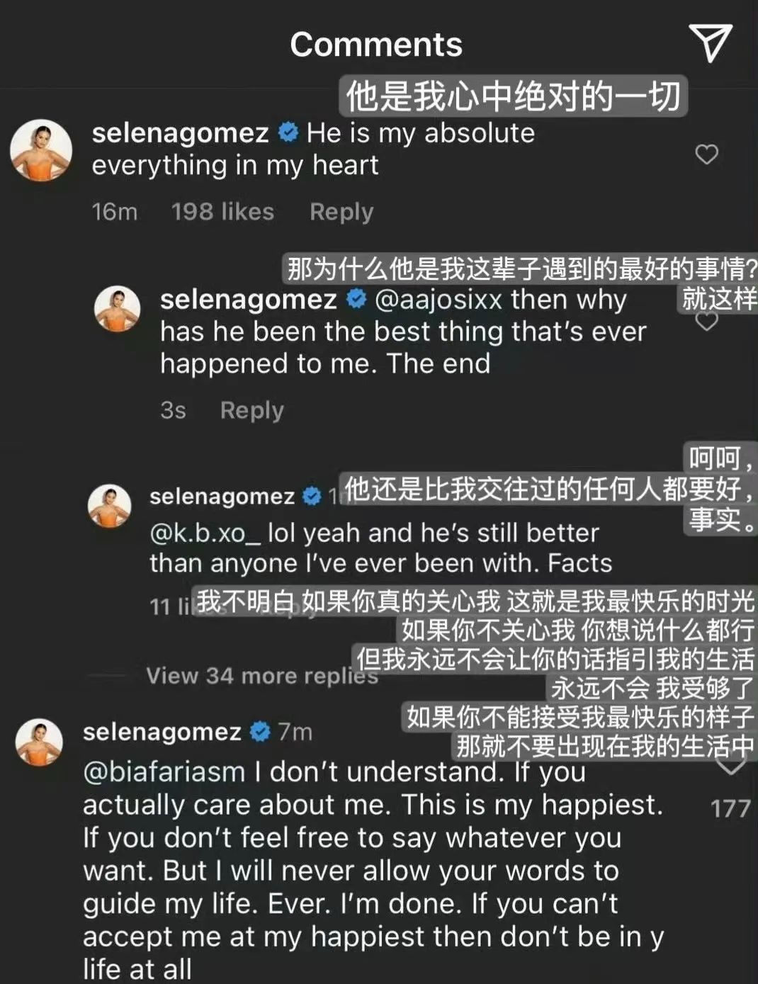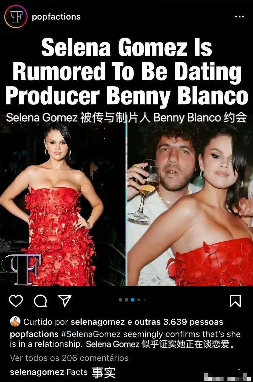 当时,外媒曝赛琳娜·戈麦斯的绯闻对象是Benny Blanco,她在下面评论承认了恋情。