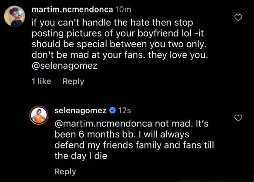 有不少人觉得这新男友不帅,各方面配不上赛琳娜·戈麦斯,她回复多个不看好恋情的评论,力挺男友。