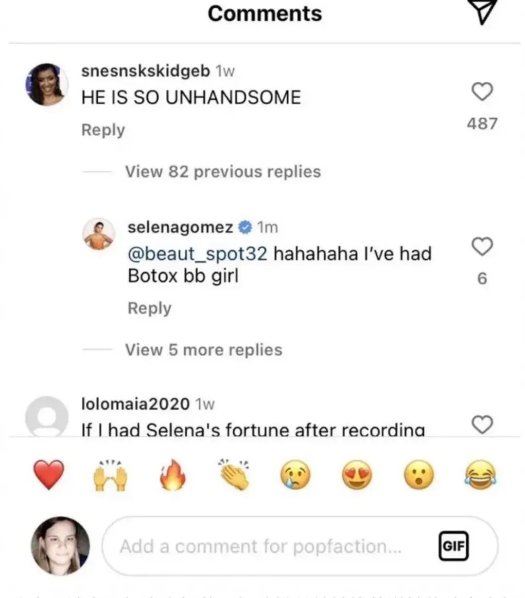 她回复那些叫她别晒男友照片的评论,别人说她男友不帅,赛琳娜自曝自己打过肉毒。