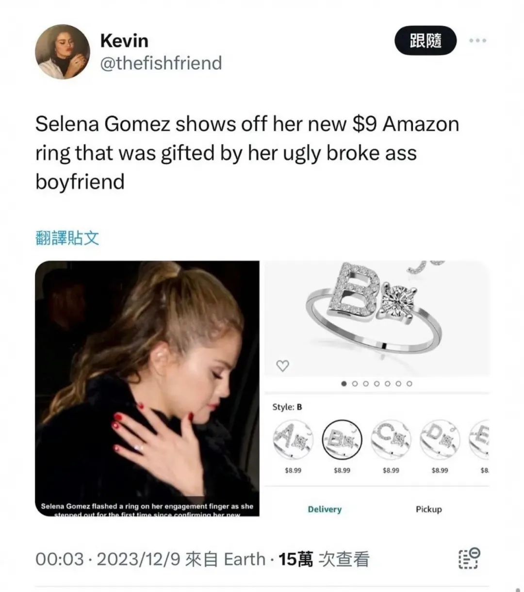 有网友发现这戒指网购估计九美元,也有人说几千。赛琳娜还在社交媒体晒出过,男友生病,她悉心照顾的动态,真的太爱了。