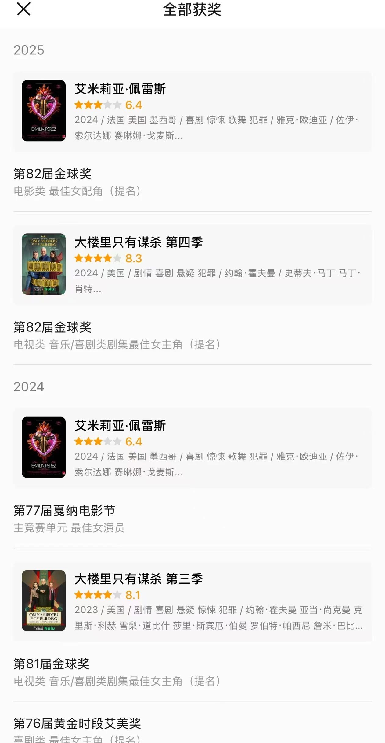 她演戏也轻松拿奖。她凭借电视剧《大楼里只有谋杀》提名金球奖“最佳音乐喜剧类剧集女主角奖”,《艾米莉亚·佩雷斯》帮她取得了金球奖最佳女配角提名。