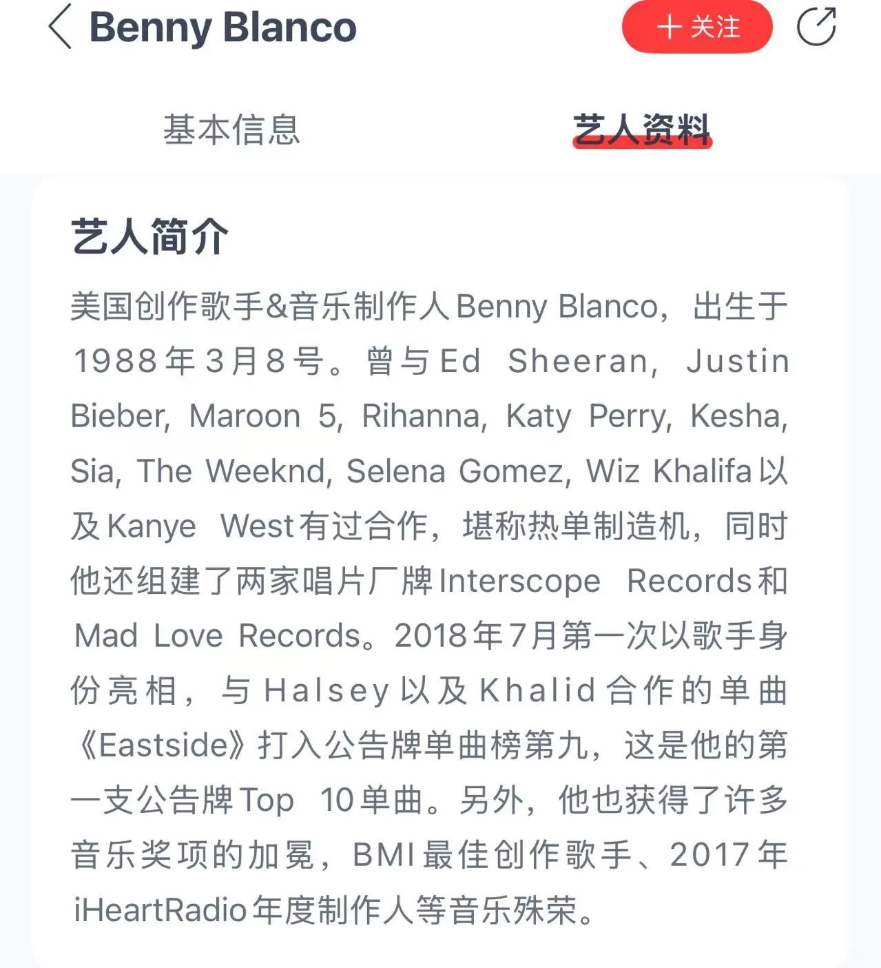 本尼曾经和“黄老板”Ed Sheeran、蕾哈娜Rihanna等合作过,为赛琳娜两位前任(比伯和盆栽The Weeknd)在内的一众乐坛巨星制作过音乐专辑。