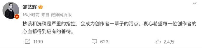 随后,《好东西》导演兼编剧邵艺辉也在当晚发文回应:“抄袭和洗稿是严重的指控,会成为创作者一辈子的污点。衷心希望每一位创作者的心血都得到应有的善待。”