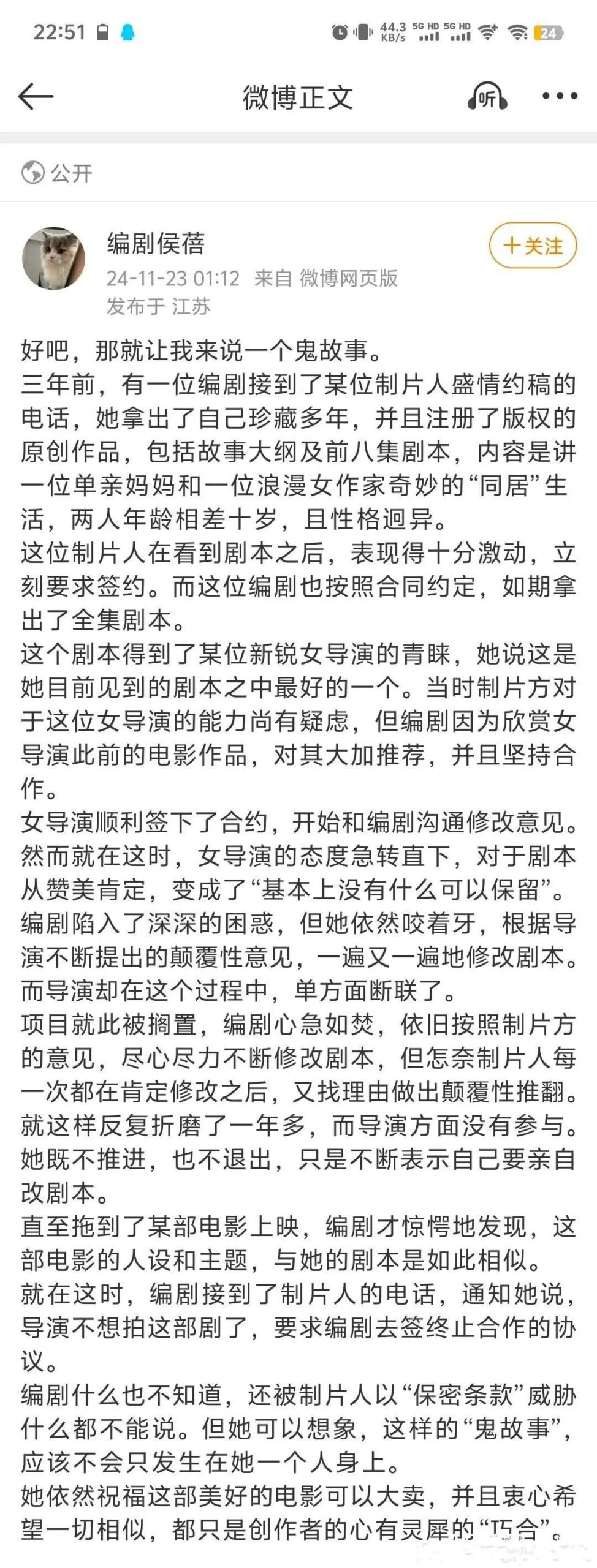 11月23日,编剧侯蓓在微博发文,以第三人称视角讲述了自己的经历。她表示三年前她用自己已注册版权的原创剧本与某制片人和某新锐女导演签约合作,但后续的合作过程中,导演态度发生巨大转变,导演和制片人都不断提出修改意见,她依旧按照要求多次修改无果,却在近期某部电影上映时发现该电影的人设和主题与她的剧本存在相似,并且被制片人通知导演不想拍了,合作项目终止。