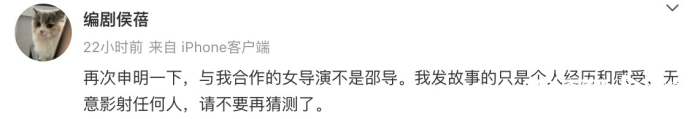 25日下午,侯蓓再次发声,表示与她合作的女导演并非邵艺辉,无意影射任何人。