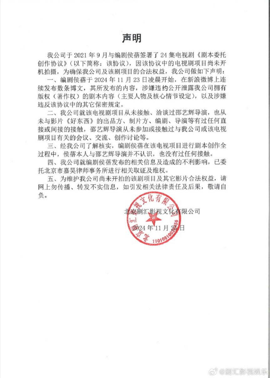 当天,与侯蓓合作的项目制片方剧汇影视文化有限公司也在微博发布声明,表示编剧侯蓓涉嫌违反协议中的保密规定,公司和侯蓓也都从未接触过邵艺辉导演,并将对侯蓓发布的相关信息及造成的不利影响进行取证及维权。