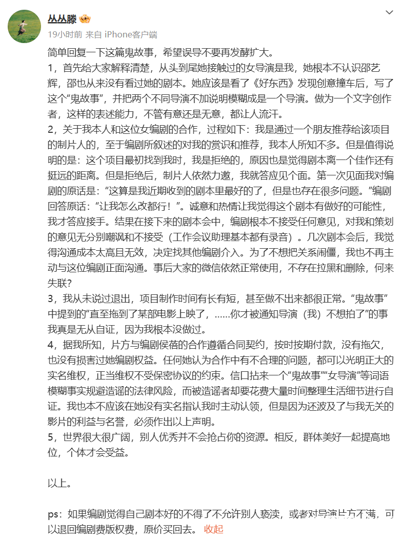对于侯蓓文中控诉的合作不顺等内容,滕丛丛也作出回应,表示是侯蓓在剧本会中不接受任何意见,自己才因为觉得沟通成本太高且无效决定找其他编剧介入,并且从未说过退出。