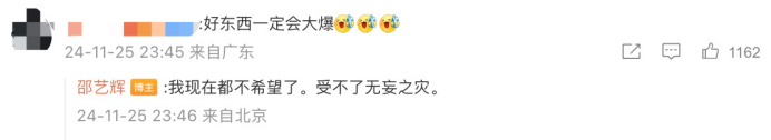在该条微博评论区,邵艺辉还表示不希望《好东西》大爆了:“受不了无妄之灾。”