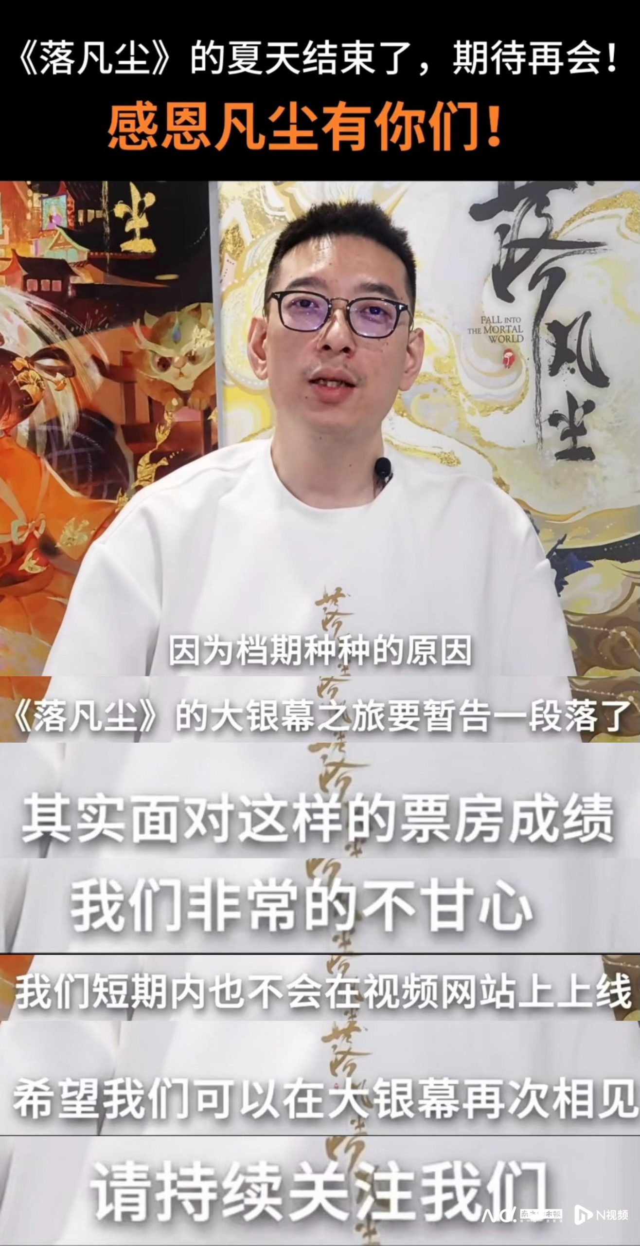 8月9日,咏声动漫发布《落凡尘》告别视频,制片人黄龙提到因为档期种种的原因,《落凡尘》的大银幕之旅告一段落。“其实面对这样的票房成绩,我们非常的不甘心,首轮放映结束了,我们短期内也不会在视频网站上上线,希望我们可以在大银幕再次相见,请持续关注我们。”