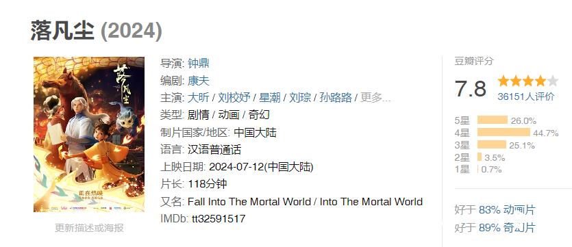 作为今年暑期档豆瓣评分最高的动画电影,《落凡尘》为何没能复制这三部动画的票房?
