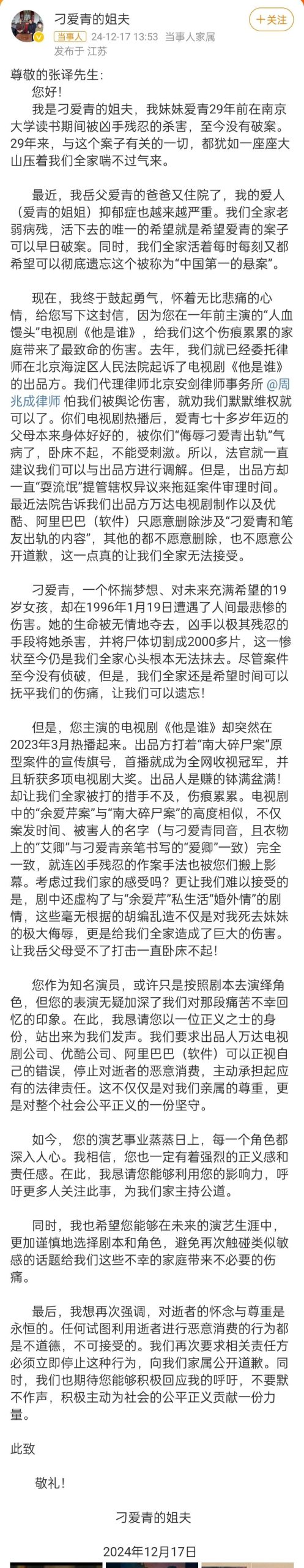 12月17日,“南大碎尸案”被害人刁爱青的姐夫在社交平台发文喊话演员张译冲上热搜。被害人家属称,张译主演电视剧《他是谁》中的“余爱芹案”与1996年“南大碎尸案”高度相似,剧中“余爱芹”婚外情情节是毫无根据的胡编乱造,是对其死去妹妹的极大侮辱,给其全家造成了巨大的伤害。家属称,张译的表演,加深了家属的痛苦回忆。刁爱青的姐夫希望该剧主演张译能站出来为家属发声,同时要求出品人、播出方停止对逝者的恶意消费,主动承担起应有的法律责任。