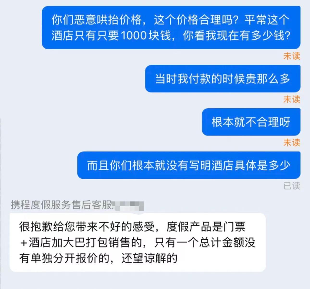 对于套餐内酒店高于常规单订价,携程客服答复“不能以单独订的酒店来对比”。