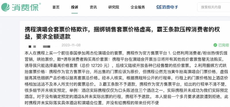 2023年11月,一名网友在消费投诉平台发帖称,在携程上购买了周杰伦泰国演唱会套餐,“根据携程所提供的行程单,门票和酒店价格相加,远远不及本人所支付的套票总价”,质疑其“虚假提高捆绑产品价格以提高套餐总价,公然充当黄牛”。