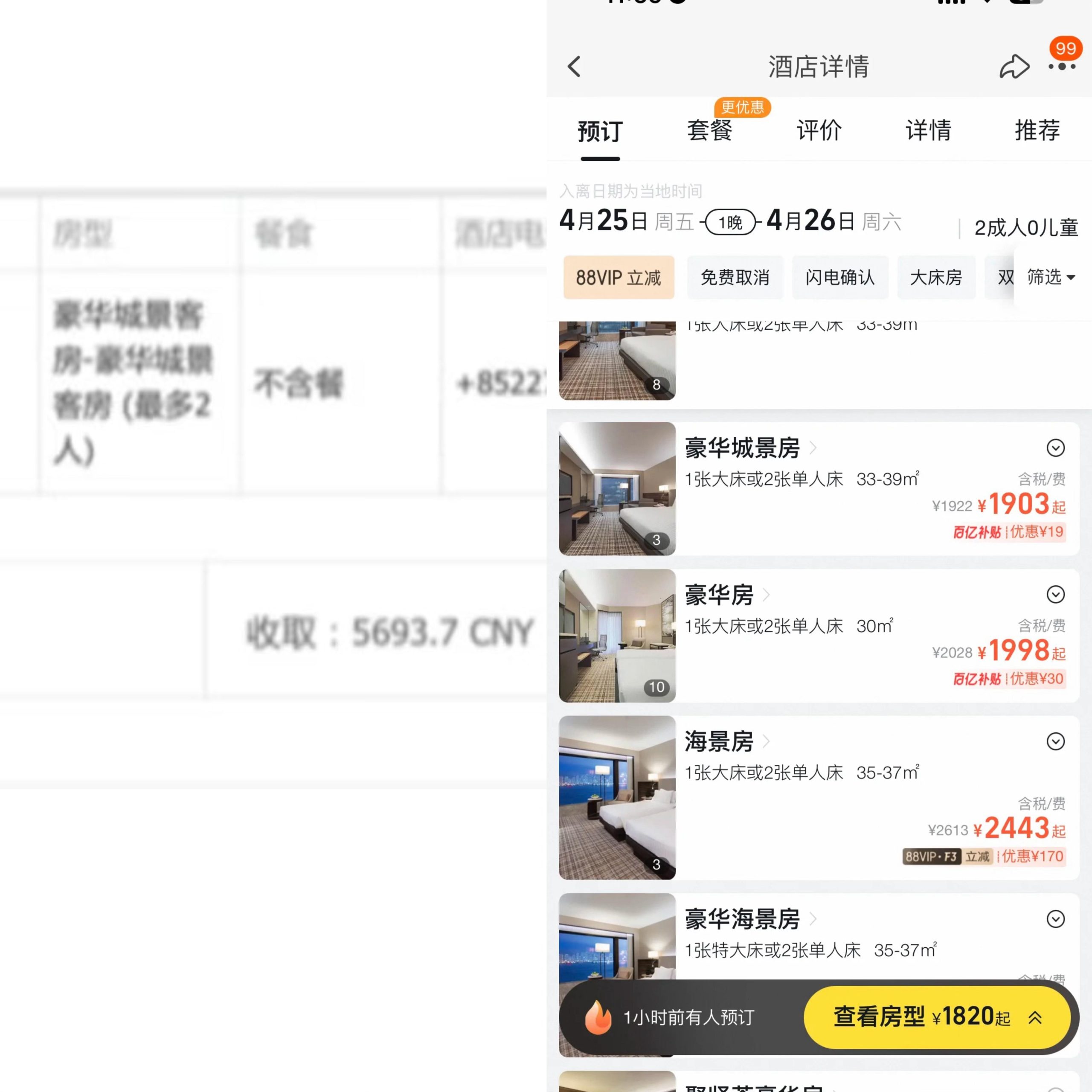 李女士购买套餐的酒店价近5700元(左),而其他平台同日同房型报价仅不到2000元(右)。