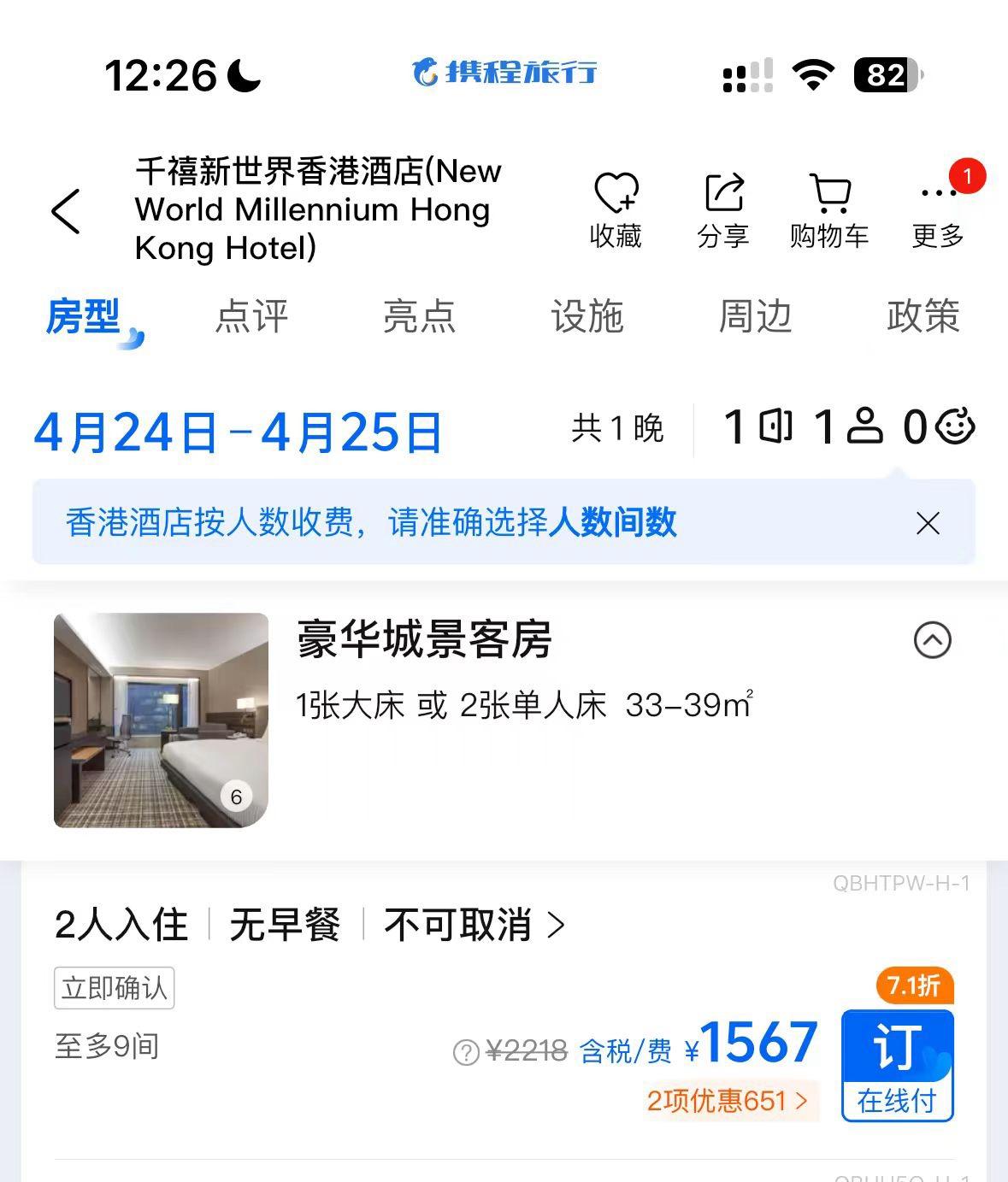2025年1月,李女士在携程花费近7000元购买4月25日谢霆锋香港演唱会套餐,包含1张1180元门票,搭售的酒店价格高达5700元。而同一酒店在携程事前的宣传页面中,显示仅为1637元/晚。