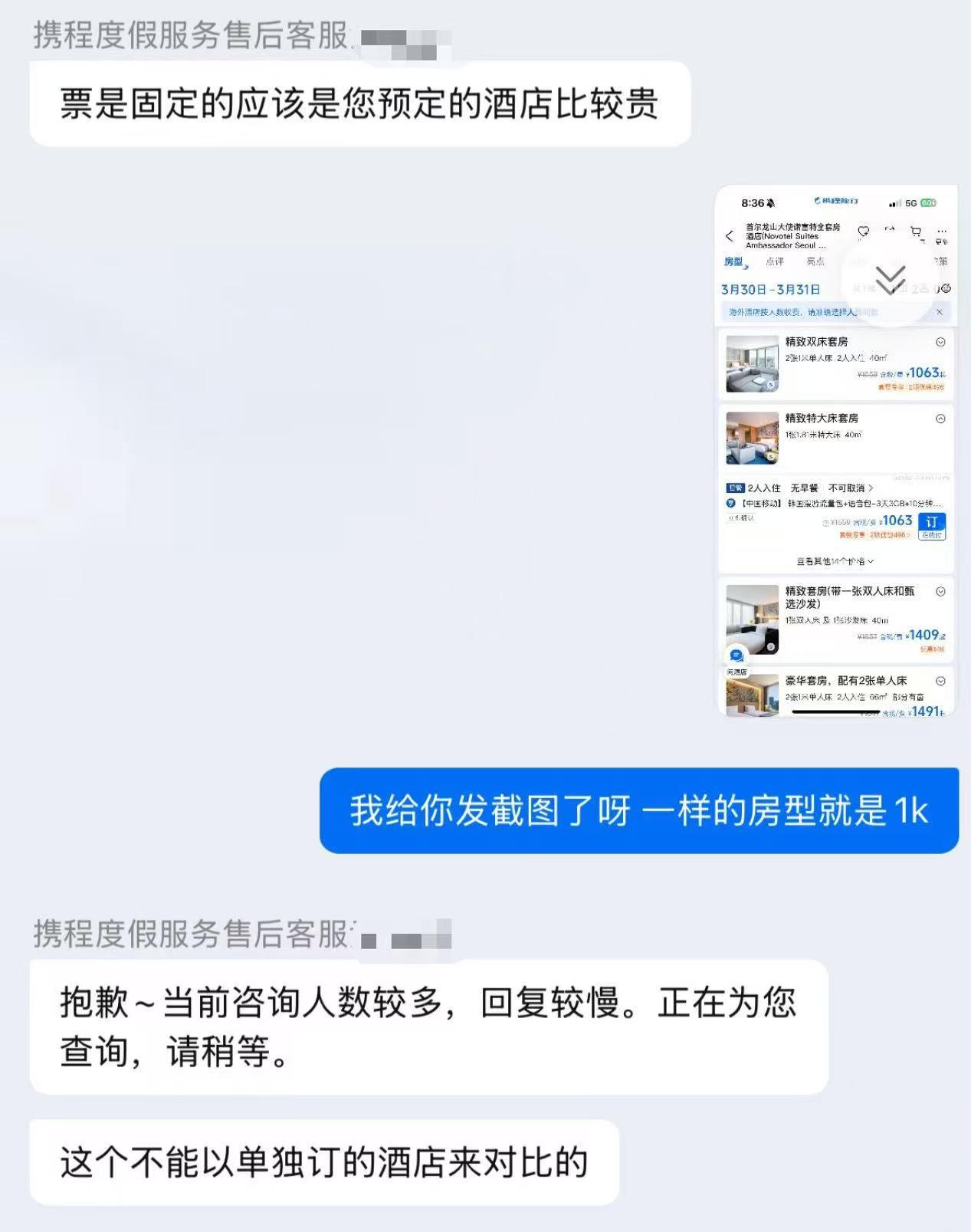 套餐内酒店价格高于常规单订价。小k下单后立即查询了同日期同房型在携程、去哪儿网的单订价,显示含税总价分别是1063元、924元,均低于他买到的1300多元酒店价格(注:因套餐未提供价格明细,为行文简洁、避免歧义,此处及下文提到的酒店价格实际均为“酒店确认单告知的酒店取消价”),与携程事前宣传的“套餐酒店价格均优于单订”不相符。小k咨询客服,得到的答复却是“不能以单独订的酒店来对比”。