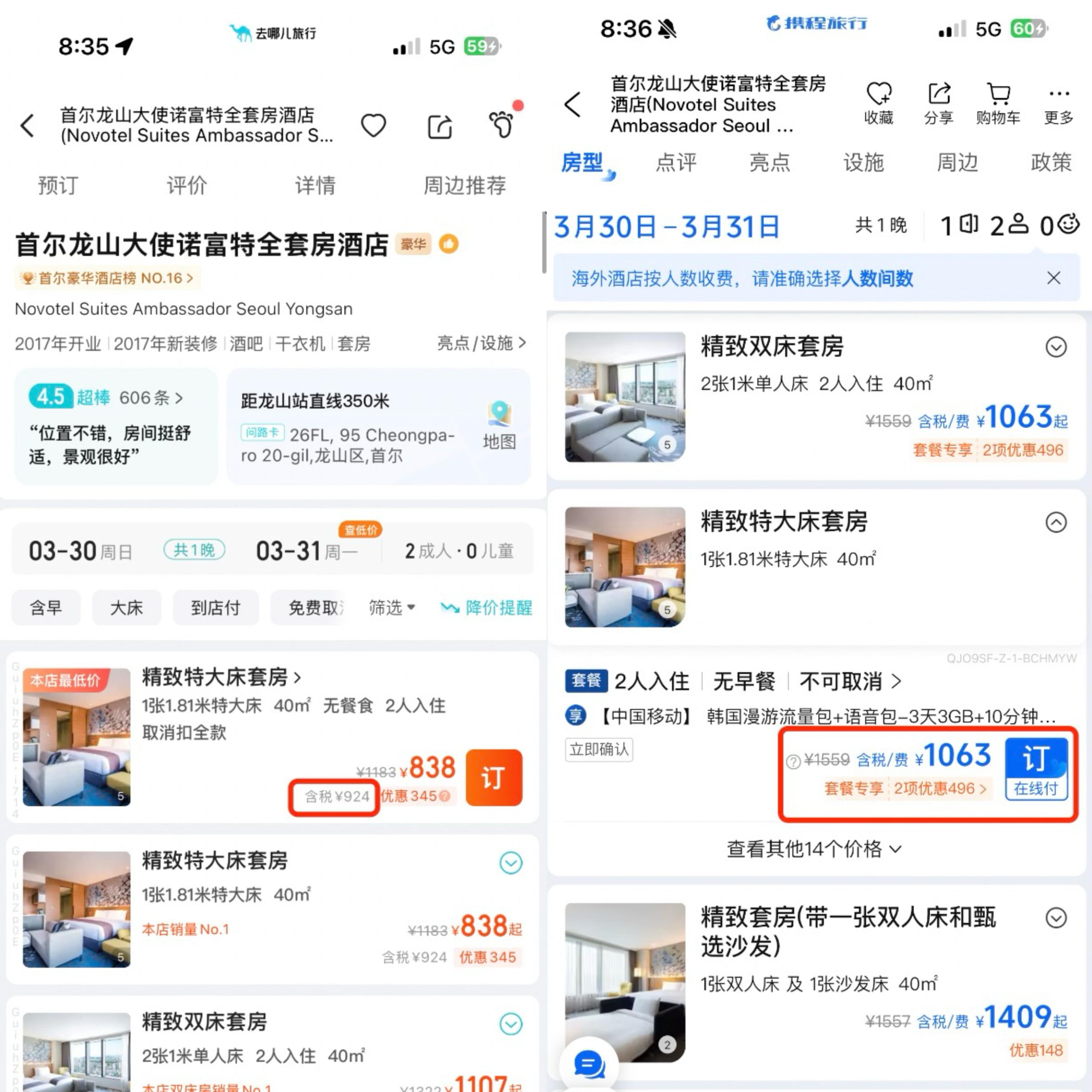 同日期同房型在携程、去哪儿网的单订价均比套餐更低。