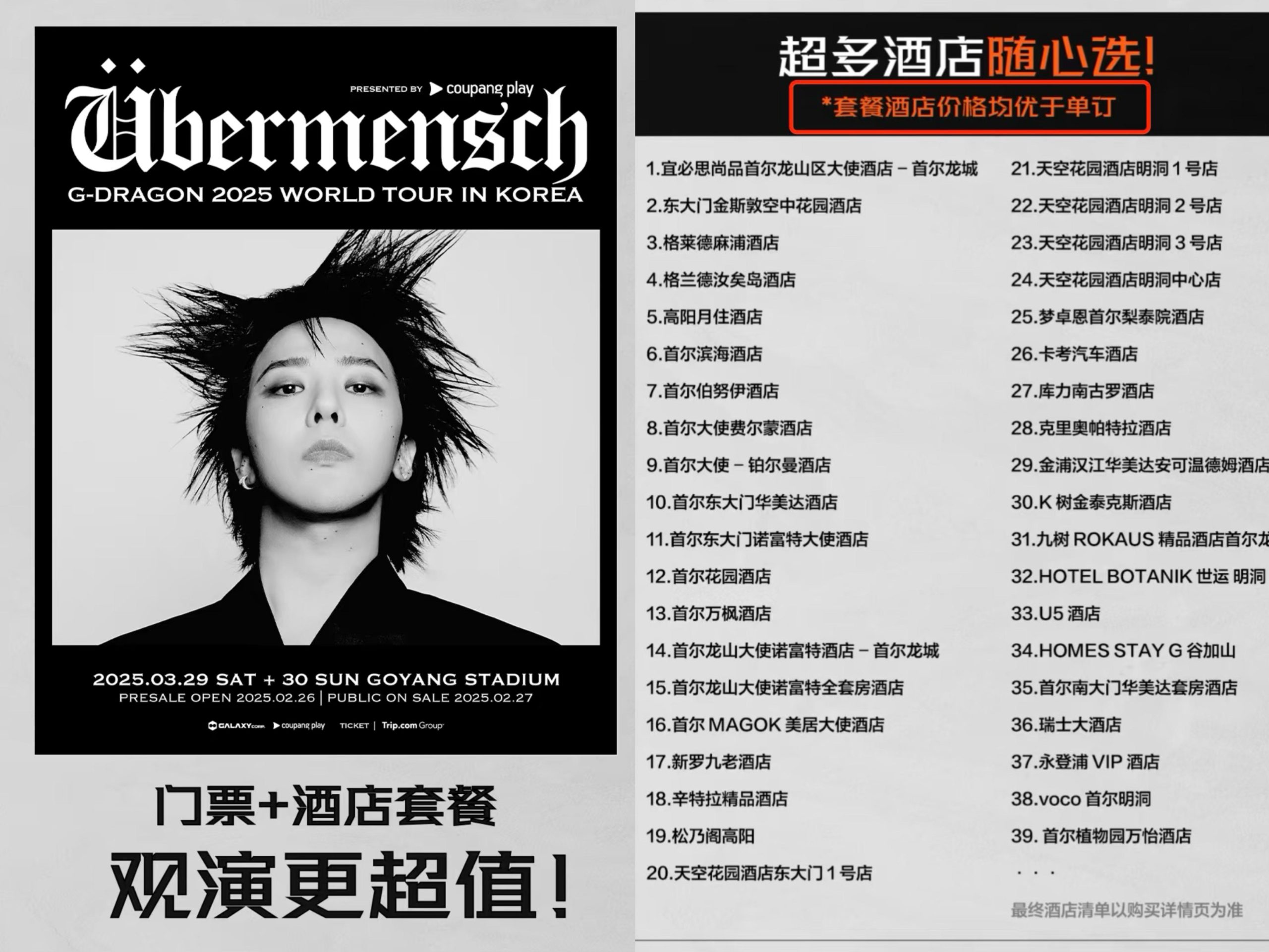 南都记者在携程官方宣传页面看到,此次权志龙演唱会套餐合作酒店有30多家,打出“观演更超值”“套餐酒店价格均优于单订”的宣传语,预订成功后不支持修改及退订。