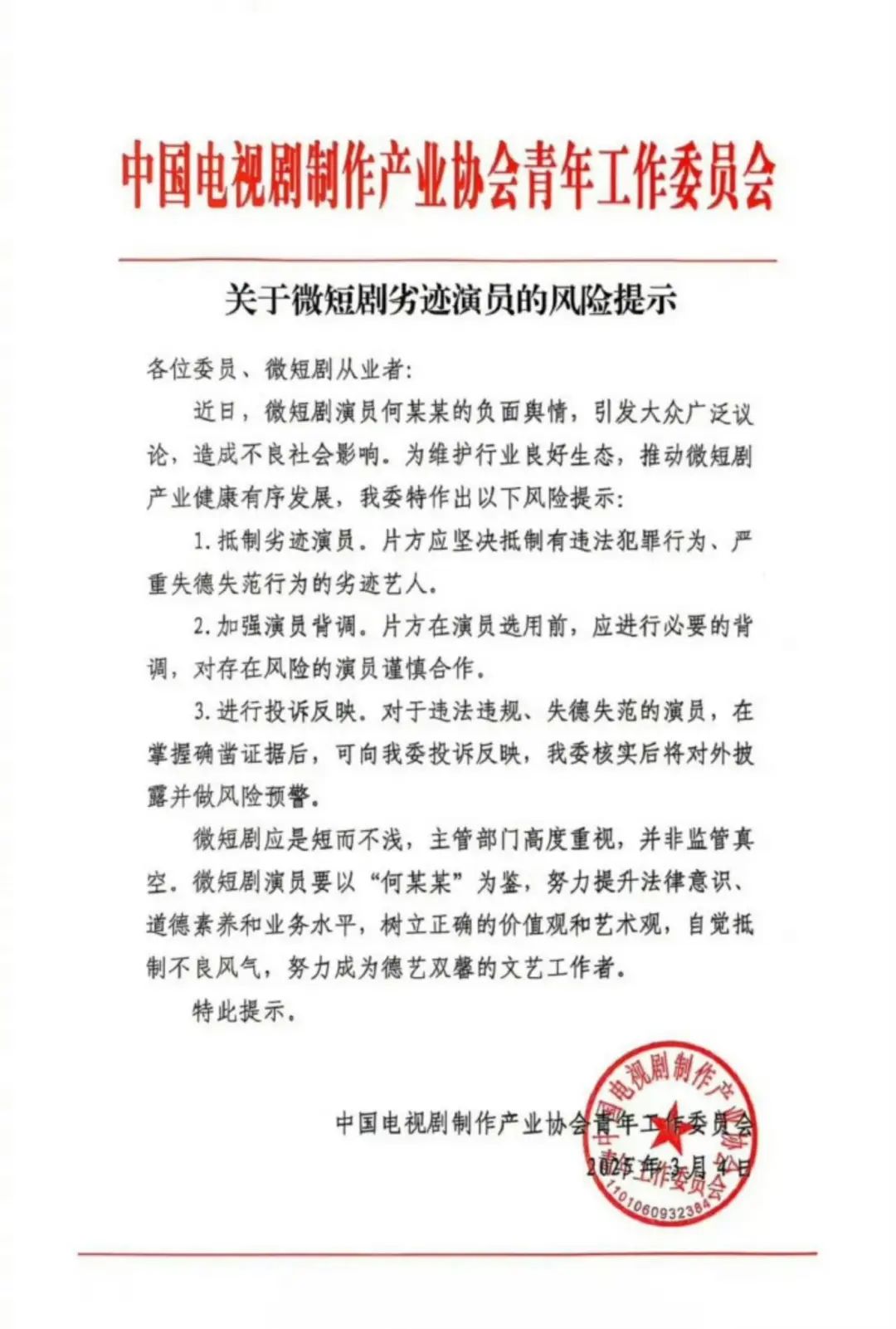 3月4日晚,中国电视剧制作产业协会青年工作委员会(简称青工委)发布《关于微短剧劣迹演员的风险提示》。