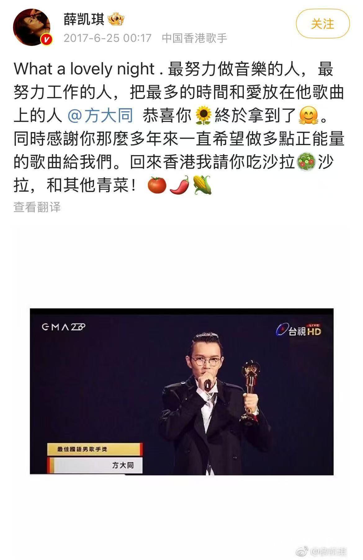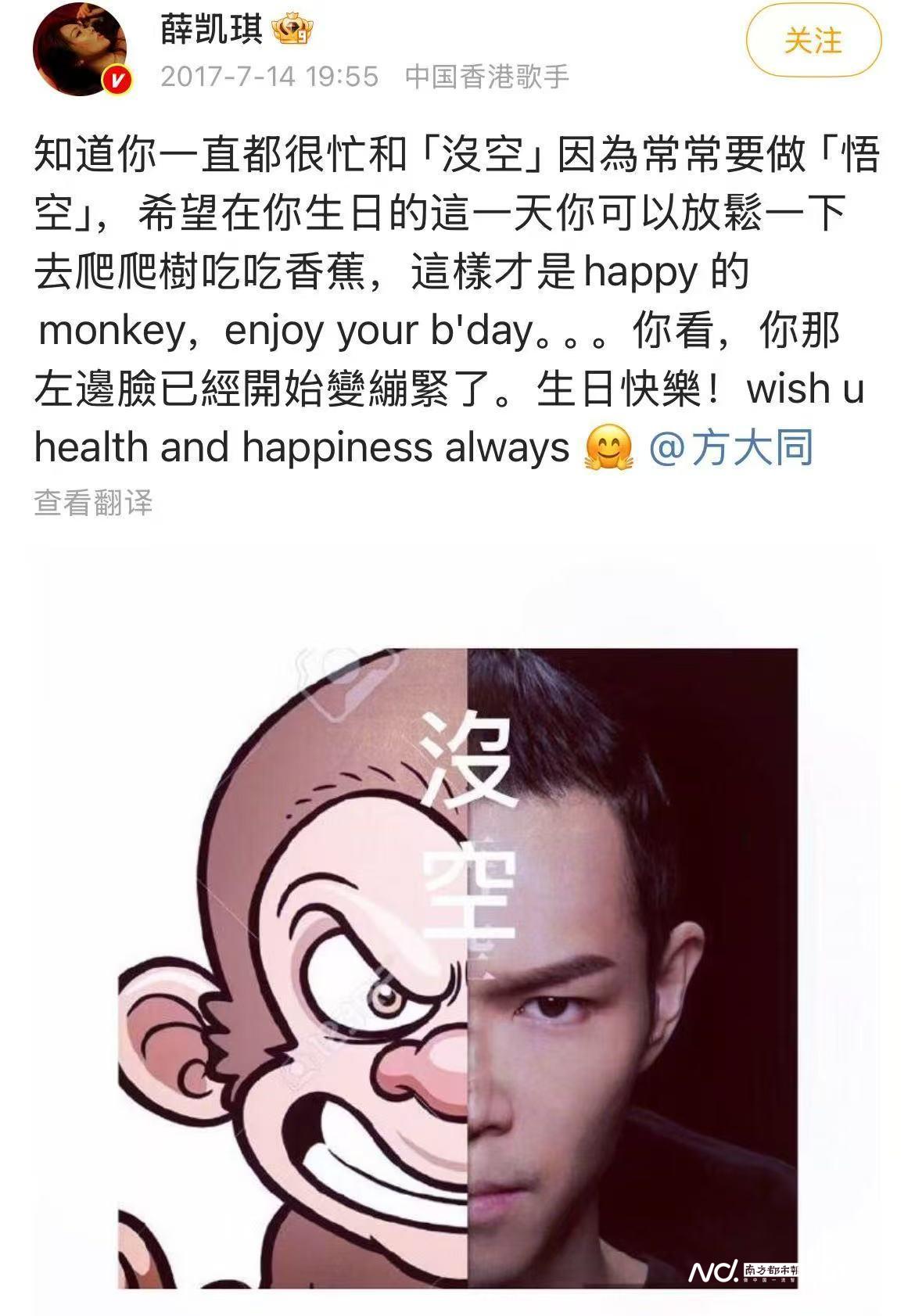 两人的关系被歌迷称道,方大同的微博更是“万年薛凯琪”,人生就是吃饭、唱歌、薛凯琪。有细心网友观察,从薛凯琪在发布生病、发新歌、获奖等内容的微博之后,方大同几乎都会转发和评论,相关内容可见方大同非常珍惜和关爱这位女性朋友。早些年网友还曾掀起一股“方大同我只能帮你到这了”的话题,帮助方大同向薛凯琪表白。