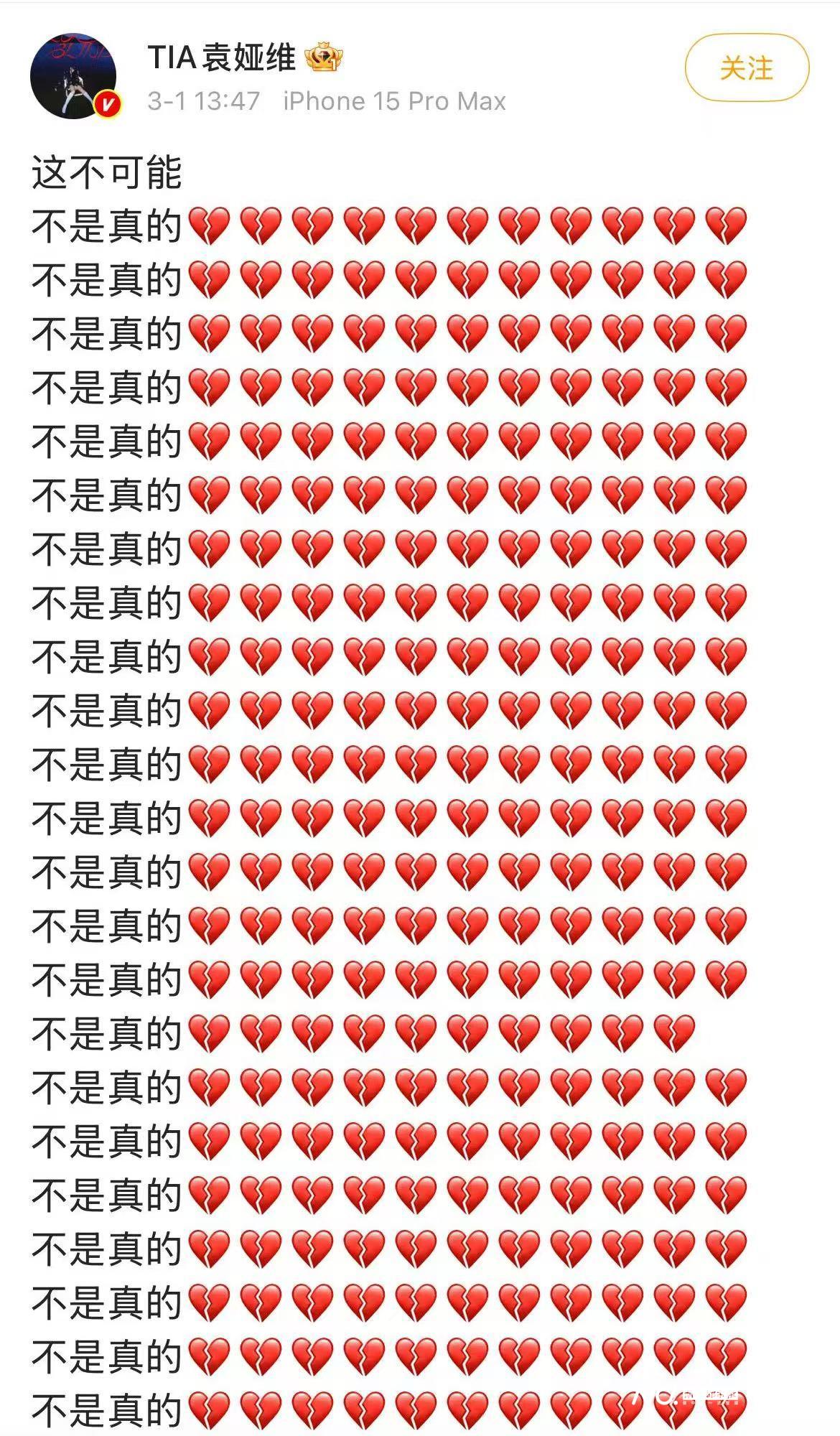 袁娅维在其微博连发多遍“这不可能,不是真的”。