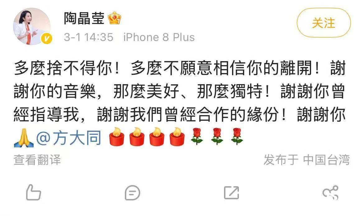 陶晶莹在其微博发文:多么舍不得你!多么不愿意相信你的离开!谢谢你的音乐,那么美好、那么独特!谢谢你曾经指导我,谢谢我们曾经合作的缘份!谢谢你。