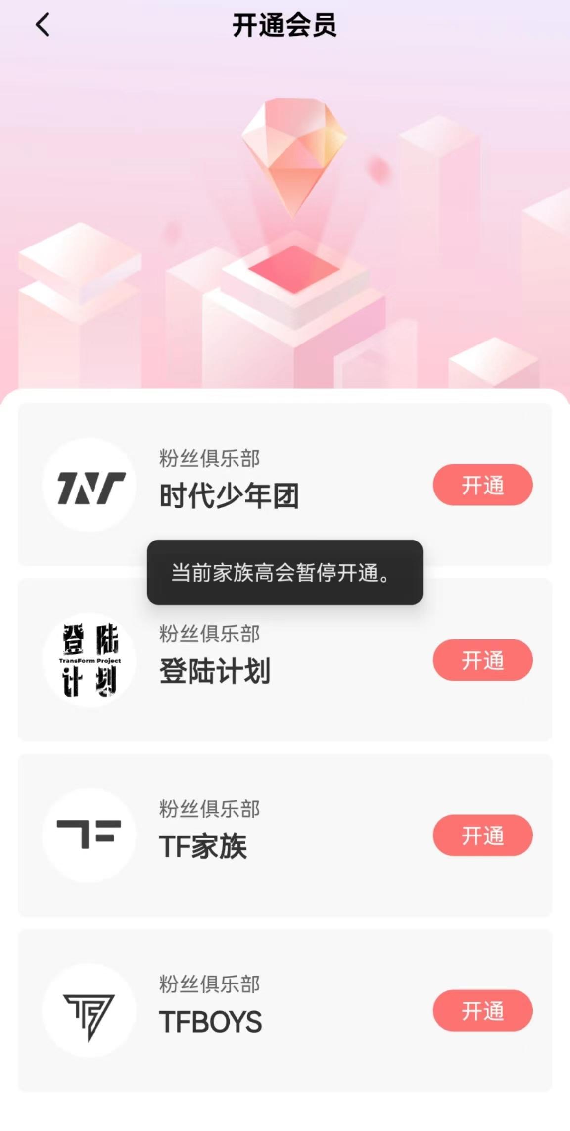 据悉,目前时代峰峻旗下共有四类粉丝俱乐部,分别为一代(TFBOYS)、二代(时代少年团)、三代(登陆计划)和TF家族(练习生)。其中,TFBOYS粉丝俱乐部高级会员已暂停开通。