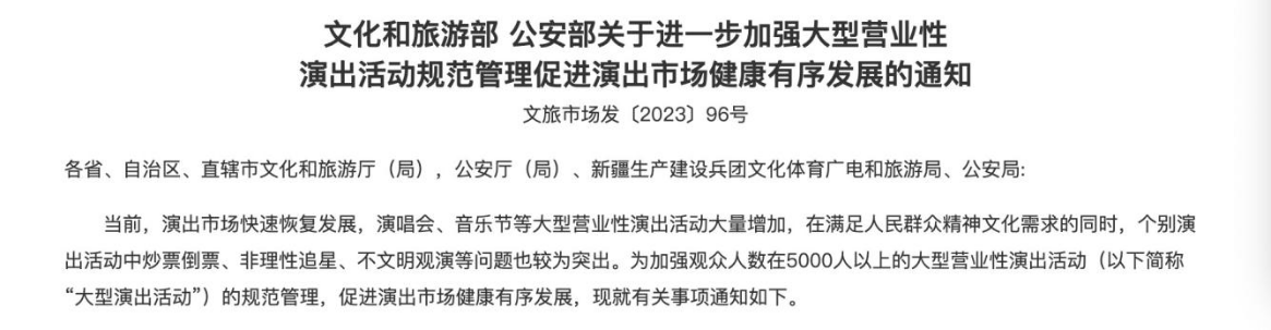去年9月,文化和旅游部、公安部曾联合发布《关于进一步加强大型营业性演出活动规范管理促进演出市场健康有序发展的通知》,《通知》要求,进一步提高大型演出活动门票销售比例,演出举办单位面向市场公开销售的门票数量不得低于核准观众数量的85%。对其余15%的门票,应当在演出前24小时进行个人信息绑定,做到“实名绑定、实名入场”。