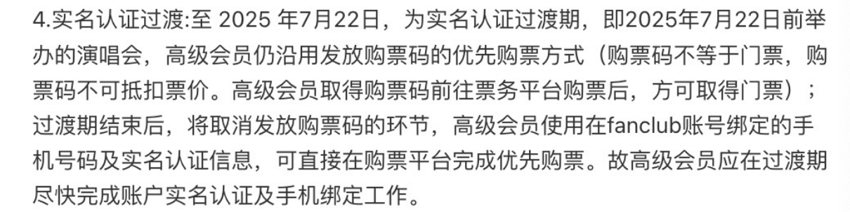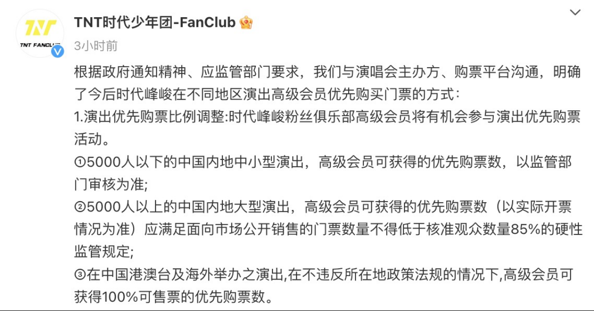 随后,时代少年团通过粉丝俱乐部官方微博账号称,根据政府通知精神、应监管部门要求,其与演唱会主办方、购票平台沟通,明确了今后时代峰峻在不同地区演出高级会员优先购买门票的方式。