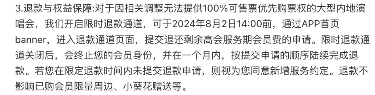 时代峰峻方也表示,对于因相关调整无法提供100%可售票优先购票权的大型内地演唱会,他们开启限时退款通道,高级会员可于2024年8月2日14:00前提交退还剩余高会服务期会员费的申请。