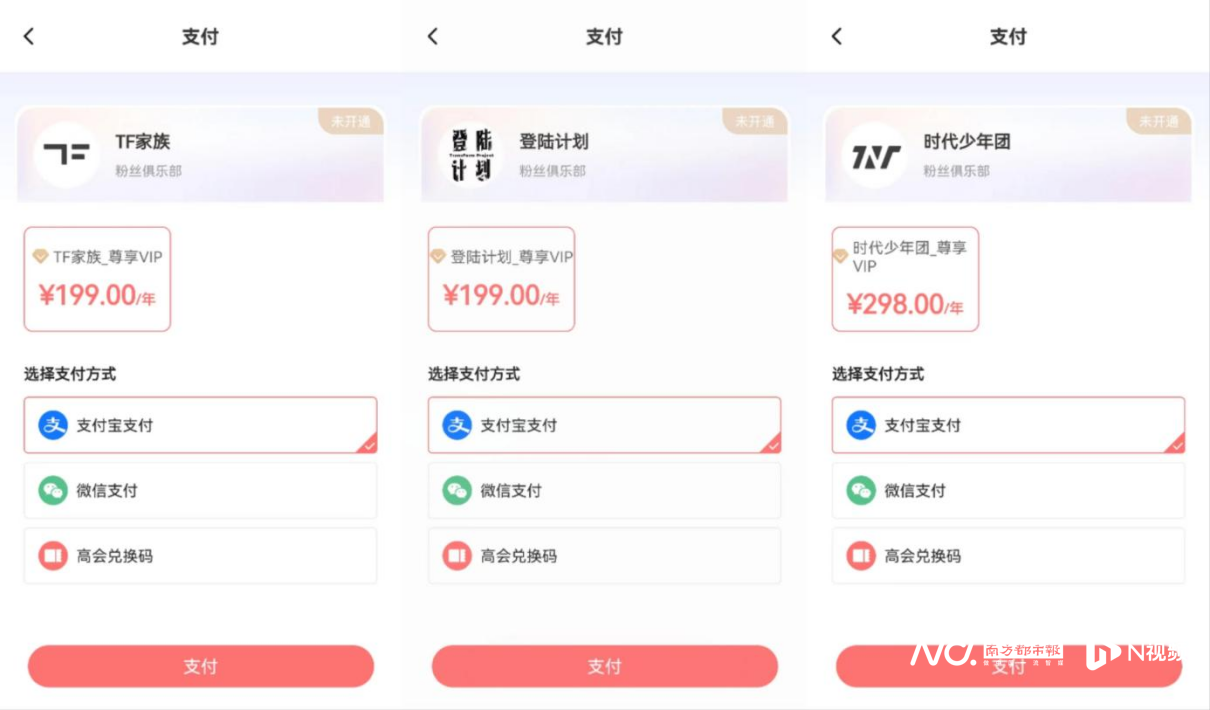 而时代少年团、登陆计划和TF家族的粉丝俱乐部会员收费标准分别为每年298元、199元和199元。