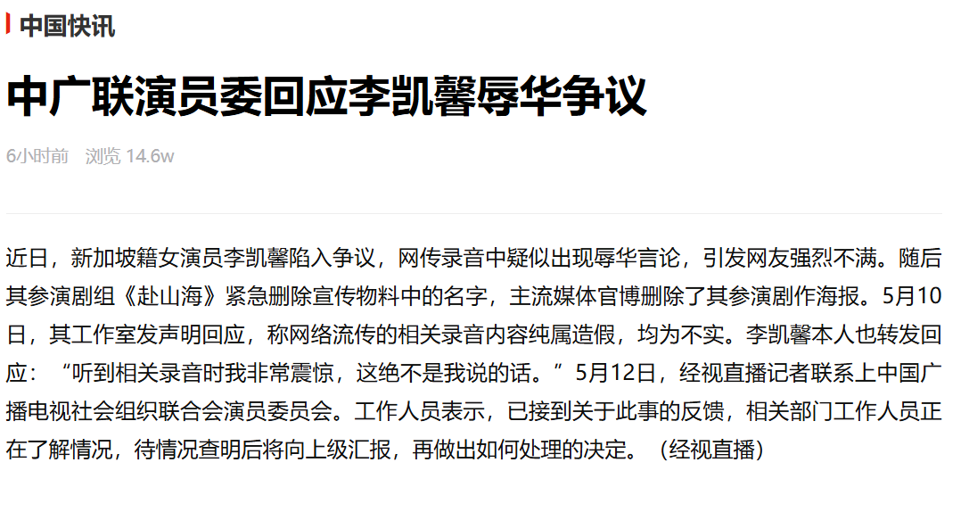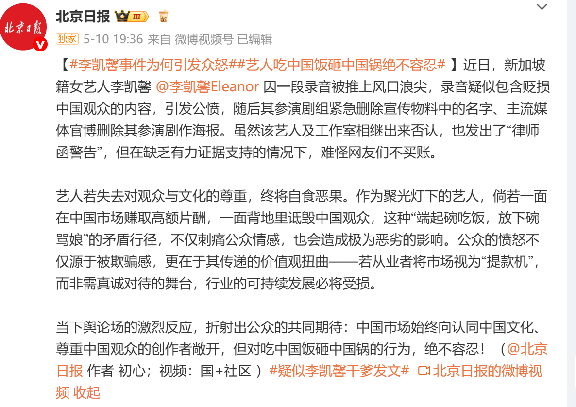 近日,新加坡籍女演员李凯馨因一段“辱华录音”事件引发争议,相关话题持续冲上热搜。