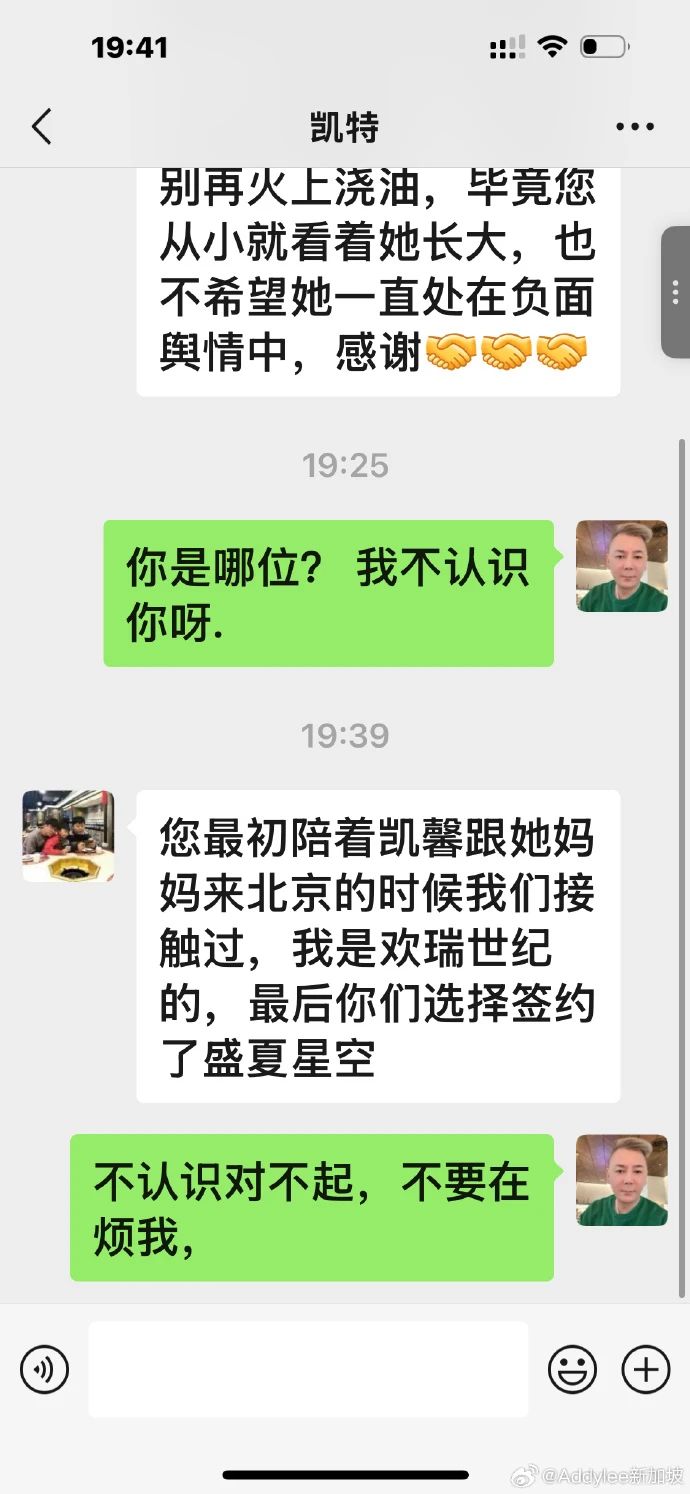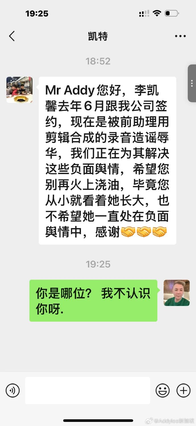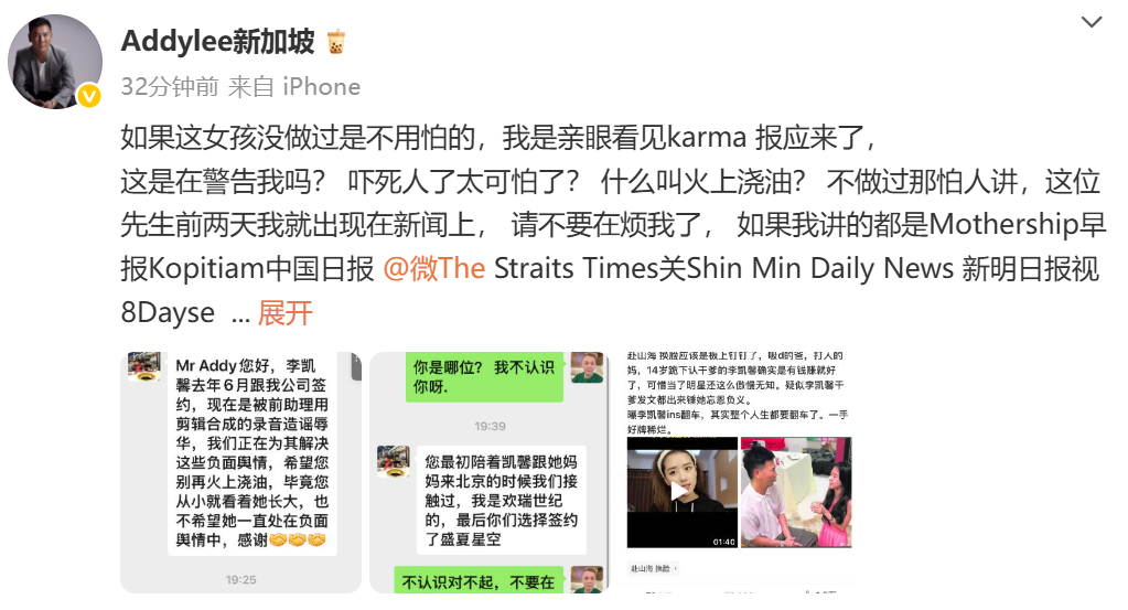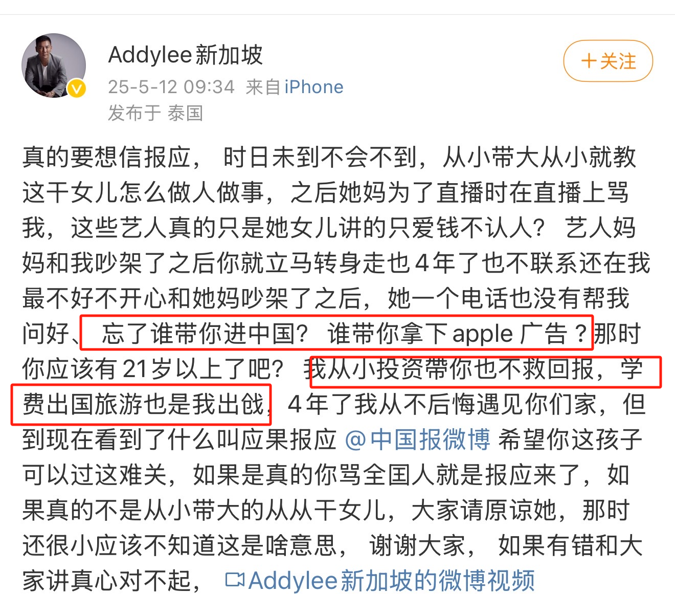 有位叫Addylee的网友发视频和长文,矛头直指李凯馨妈妈,“忘了谁带你进中国,谁带你拿下apple广告?….我从小投资带你也不求回报,学费出国旅游都是我出”,最后他又请大家原谅李凯馨: “那时还很小应该不知道这是啥意思,谢谢大家,如果有错和大家讲真心对不起。”