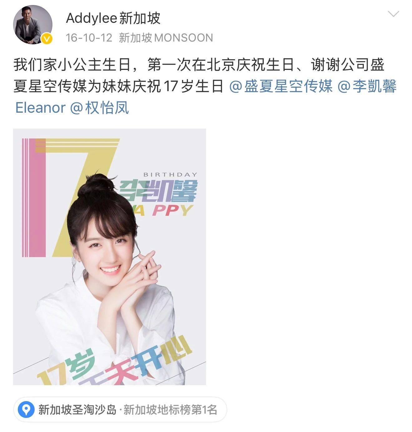 据悉,李凯馨1999年出生,是新加坡籍华裔影视女演员、歌手。她母亲权怡凤是从中国台湾到新加坡发展的艺人,多年前就有报道李凯馨有个干爹叫李荣达