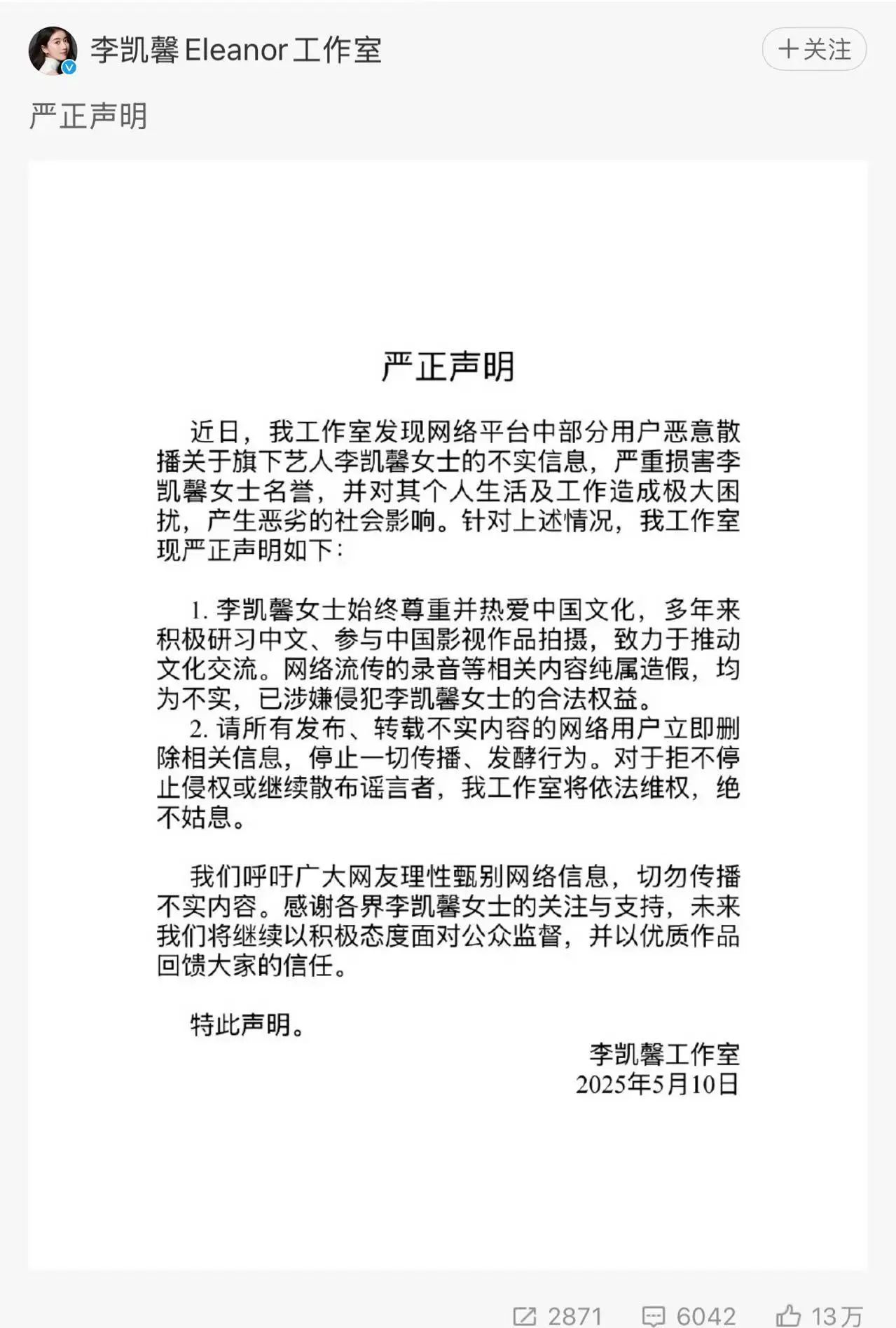 5月10日下午,李凯馨工作室发严正声明回应“网传李凯馨录音”事件,称“网络流传的相关录音内容纯属造假,均为不实。请停止一切传播、发酵行为,工作室将依法维权。”