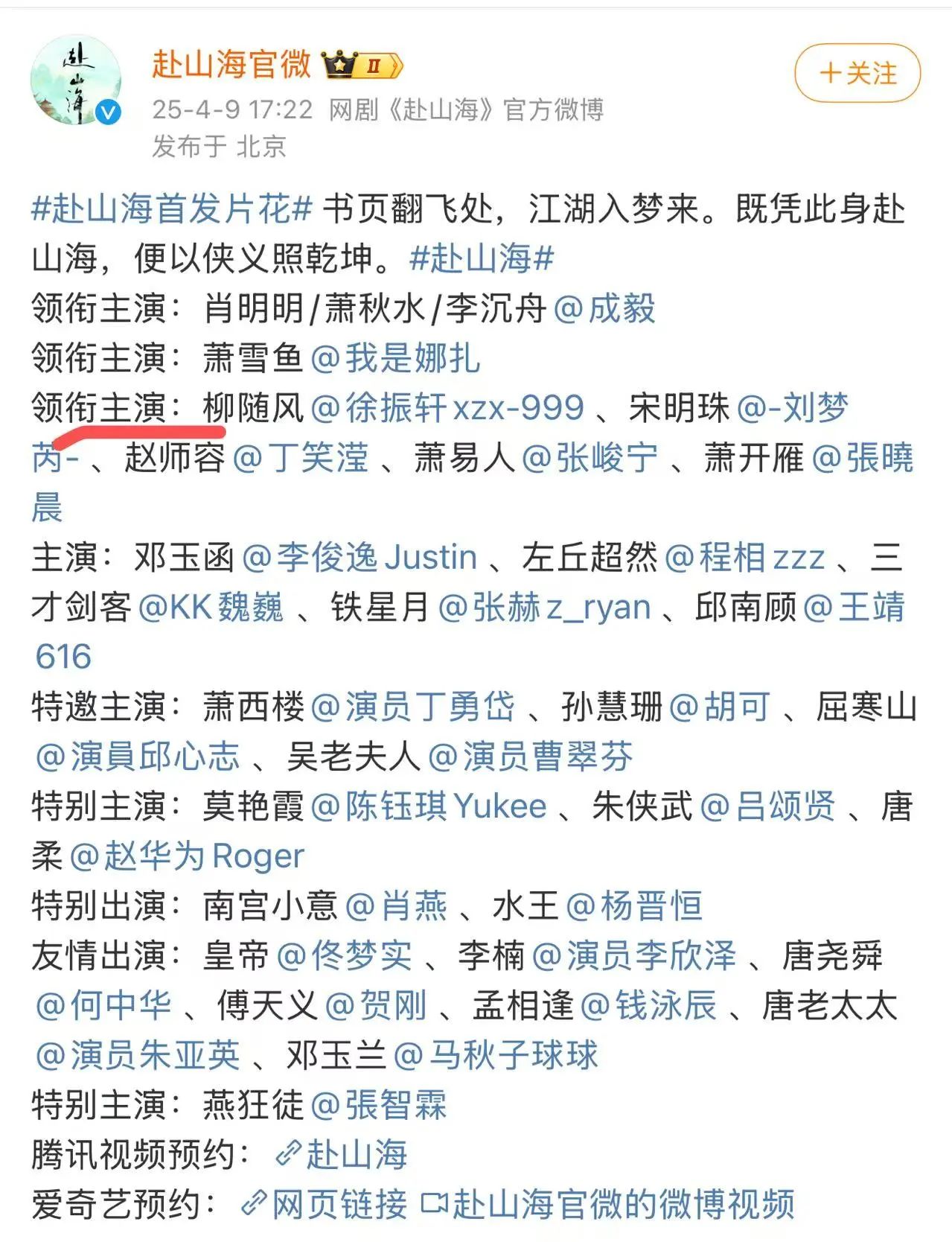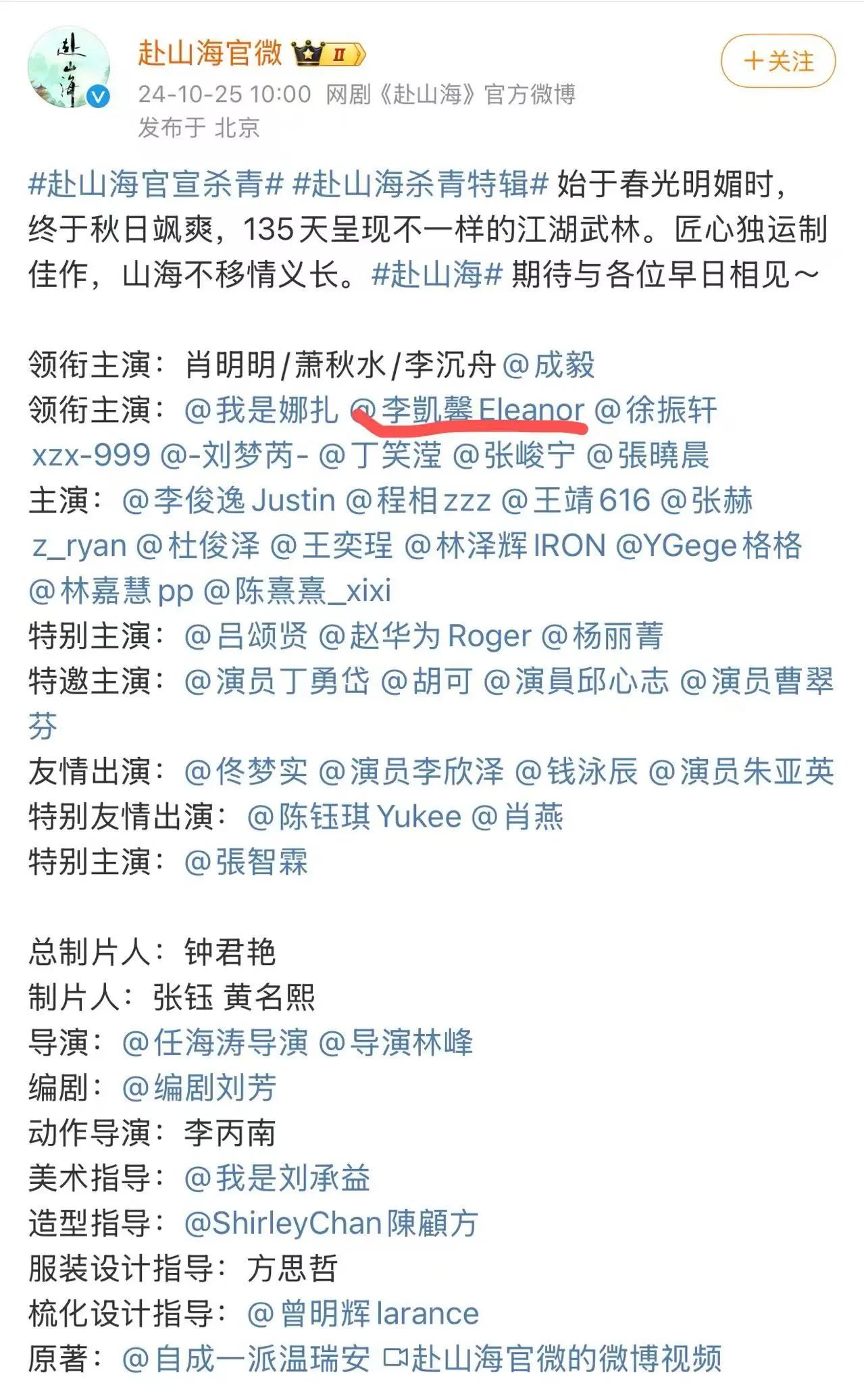 目前,赴山海官方发布的与李凯馨相关的微博仅剩“#赴山海官宣杀青#”一条,4月9日官方发布的“#赴山海首发片花#”中的领衔主演并没有艾特李凯馨。