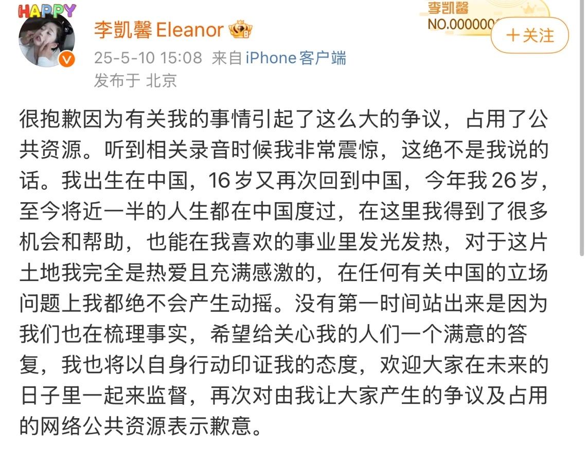 随后,李凱馨转发声明并发文致歉,称“听到相关录音时候我非常震惊,这绝不是我说的话。”
