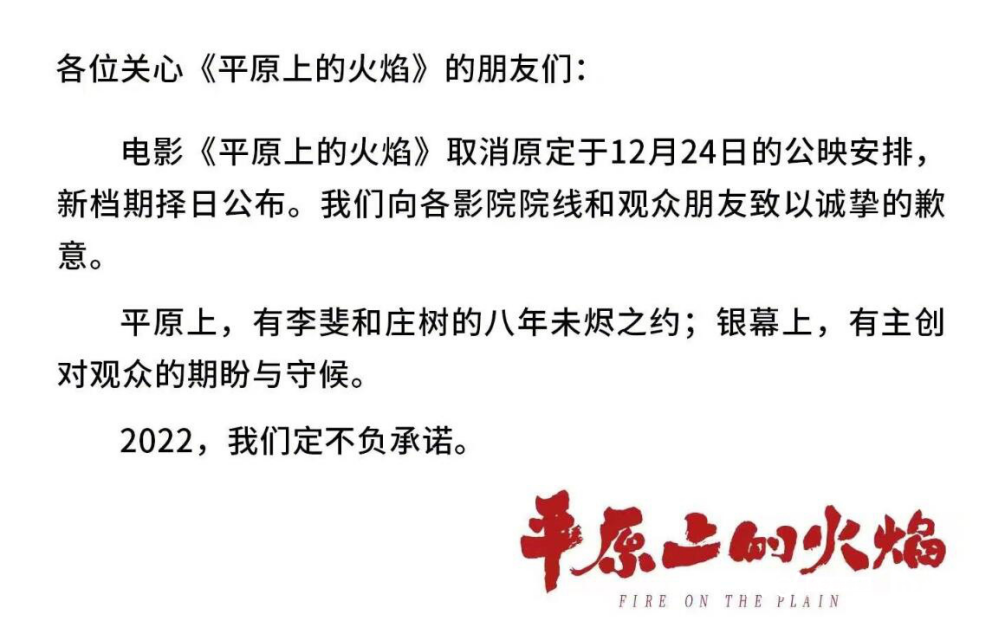 《平原上的火焰》原定于2021年12月24日上映,却在公映前4天(12月20日)突然宣布撤档,引发舆论热议。当时影片已开启预售并收获超340万元票房,但片方以“新档期择日公布”的声明紧急叫停,退票处理令观众感到不解。与此同时,片方宣布把原片名(也是原著小说名)《平原上的摩西》更改为《平原上的火焰》,引发了原著粉丝的批评。