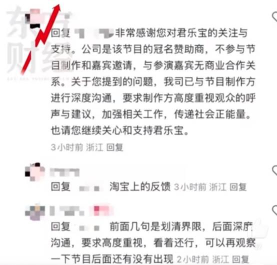随后,另有网友贴出了节目另一赞助商君乐宝对此事的回应,“非常感谢您对君乐宝的关注与支持。公司是该节目的冠名赞助商,不参与节目制作和嘉宾邀请,与参演嘉宾无商业合作关系。关于您提到的问题,我司已与节目制作方进行深度沟通,要求制作方高度重视观众的呼声与建议,加强相关工作,传递社会正能量。也请您继续关心和支持君乐宝”。有媒体询问君乐宝在线客服处理进展,对方表示:“相关部门还未给我们答复,这边已经在尽量减少她(麦琳)的镜头了,后续可以持续关注一下。”