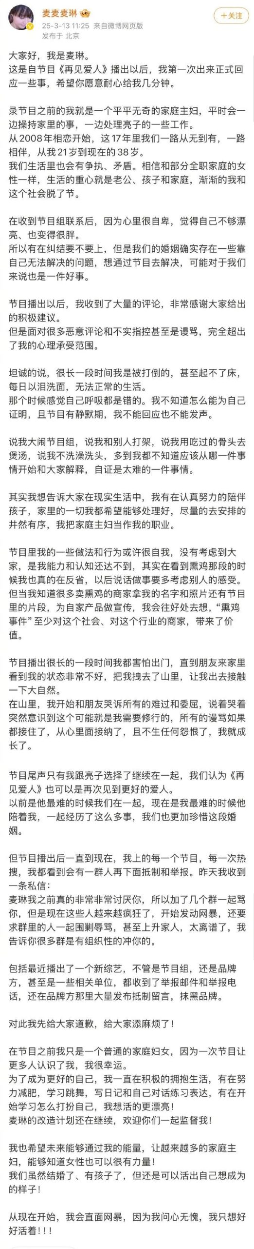 伴随舆论发酵,今日中午,麦琳发布长文作出回应。
