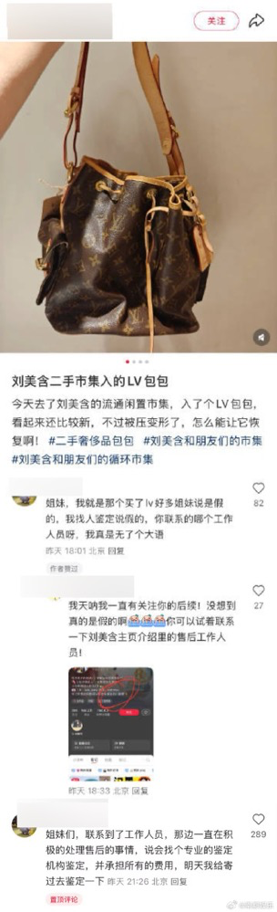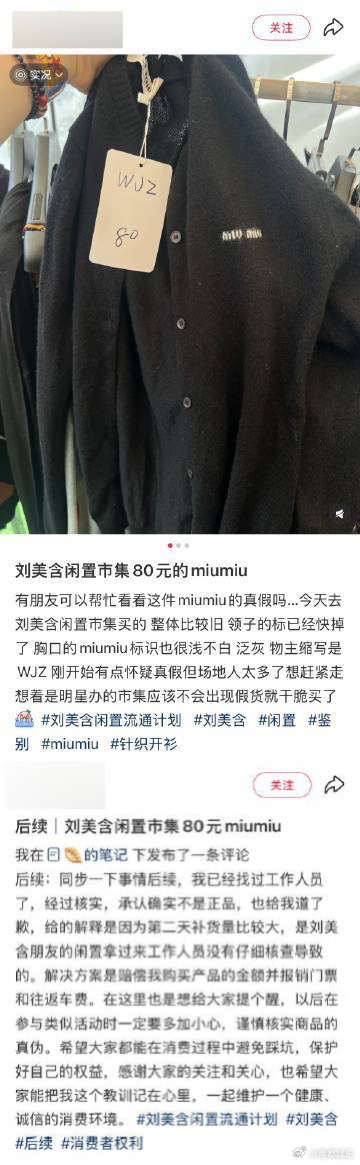 一网友发帖称在刘美含闲置市集买到了假的大牌针织衫和包包,引发热议。
