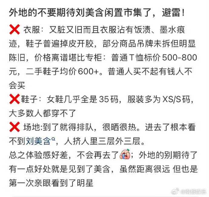 根据搜索显示,网友对刘美含的市集评价褒贬不一。有网友发帖避雷,但也有网友说自己买到了很划算的大牌,还能偶遇明星,体验感很好。据悉,刘美含的市集不仅有自己的闲置物品,也有自己好友的闲置物品。
