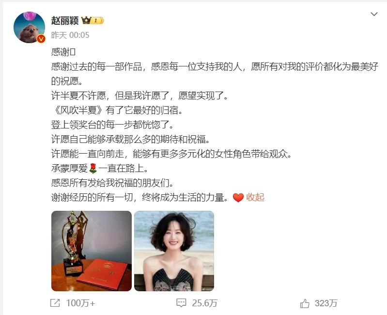 电视剧和电影领域双丰收,赵丽颖高兴,粉丝更高兴。得奖消息一出,就出现了这张赵丽颖得奖复盘图。