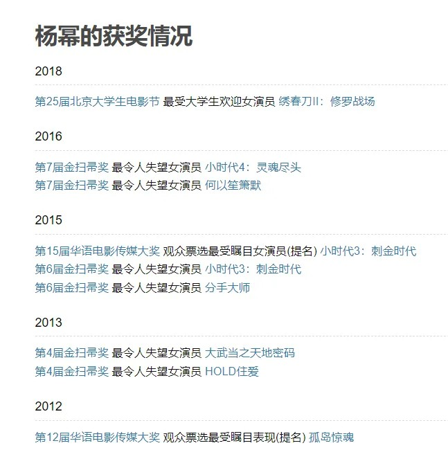 回看杨幂影视类得到过的奖,说实话都有点“水”。豆瓣词条上,给杨幂收录最多的奖项,竟然是金扫帚最令人失望女演员奖。