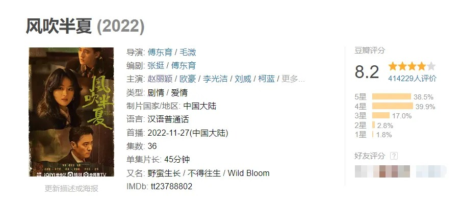 《风吹半夏》目前在豆瓣上是8.2分,曾经获得过第28届上海电视节白玉兰奖最佳中国电视剧的提名。如今,该剧又多了两项殊荣:“飞天奖”优秀女演员和优秀电视剧。